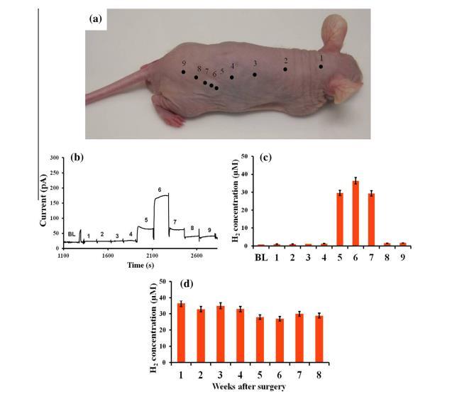 圖3、AZ31植入皮下1周后,對麻醉裸鼠進行H2測量。(a)標有測量點并編號的小鼠照片。(b)與(a)中編號點相對應(yīng)的瞬間電流反應(yīng)。(c)根據(jù)校準曲線測定的各點H2濃度。BL是在空氣中的測量值。(d)AZ31(N=3)在為期8周的研究期間每周監(jiān)測的H2濃度。每只小鼠以植入物正上方為中心進行一次測量。