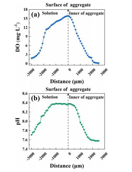 吡啶的生物降解與脫氮效果與ABS系統(tǒng)中的DO和pH分布有關(guān)密切相關(guān)。如圖2a所示,DO的峰值濃度高達(dá)15.9mg?L-1,位于ABA表面,表明DO的產(chǎn)生位點(diǎn)主要通過光合作用分布在ABA表面。然而,在黑暗和明亮?xí)r期,散裝液體中的DO濃度始終小于0.2mg?L-1(圖S2)。當(dāng)ABA的深度從0μm增加到2500μm時(shí),DO度從15.9mg?L-1逐漸降低到0.2mg?L-1,表明ABA內(nèi)部存在缺氧微環(huán)境。在ABA表面(從0μm到-3000μm),DO濃度從15.9mg?L-1逐漸降低到1.8mg?L-1,表明ABA中含氧量增加。DO剖面顯示了具有DO梯度的微環(huán)境,其中好氧區(qū)、缺氧區(qū)和厭氧區(qū)共存于ABA中。