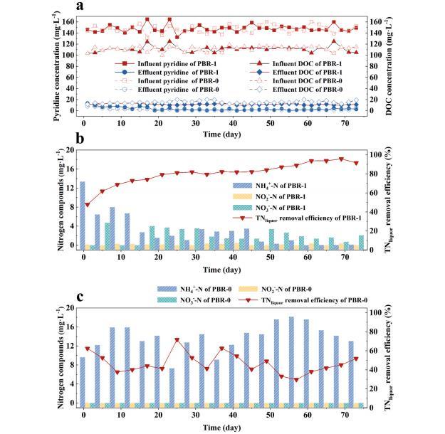 圖1(a)PBR-1和PBR-0中吡啶和DOC濃度的分布圖;(b)氮化合物濃度和TN在PBR-1中的去除效率;(c)氮化合物濃度和TN在PBR-0中的去除效率