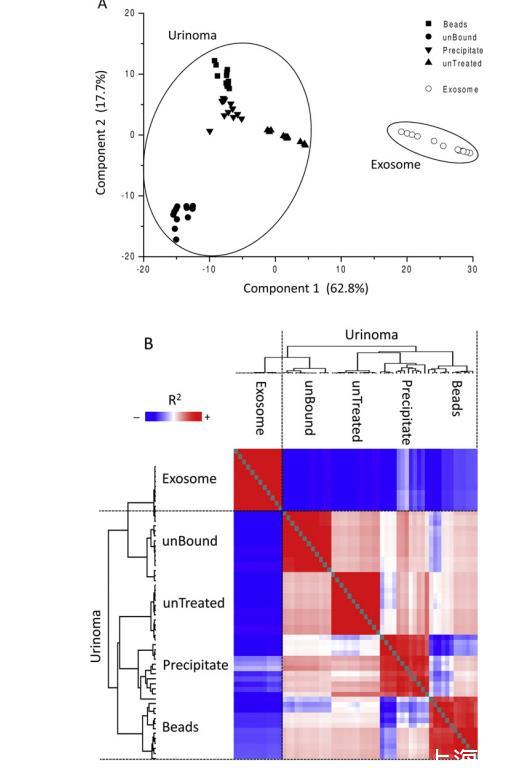 圖3與外泌體和不同尿液組分的無監督分層聚類分析相關的主成分分析和斯皮爾曼相關圖。樣本來自21名健康捐獻者。A,外泌體(圓圈)和尿液組分主成分分析的二維散點圖,即:未處理(上三角)、沉淀(下三角)、珠子(正方形)和未結合(點)。B,斯皮爾曼相關圖:系數值用從0.1(藍色)到0.9(紅色)的偽彩色標尺表示。此外,樹狀樹枝圖顯示了無監督分層聚類分析的結果,將相似的斯皮爾曼系數值相互靠近。兩幅圖都顯示了外泌體和尿瘤之間兩個明顯的獨立聚類。