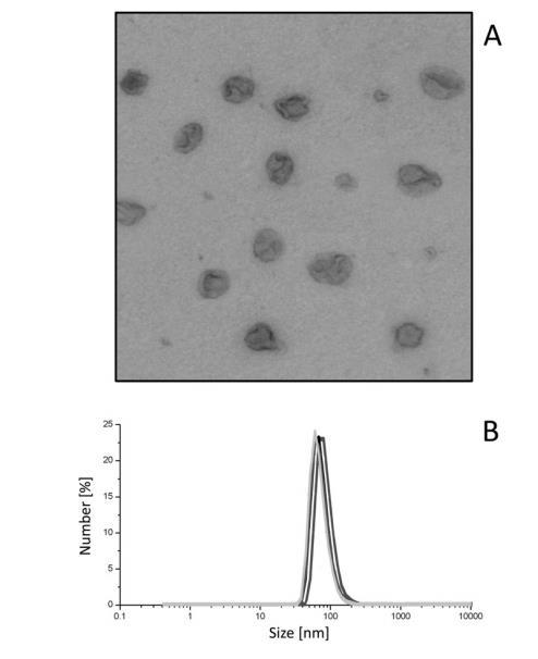 圖1分離的外泌體的特征。圖A:分離的尿液外泌體的代表性透射電子顯微鏡圖像。圖B:通過動態光散射評估的外泌體大小分布圖。該圖顯示了一個高斯分布曲線,平均峰值為80±8nm。