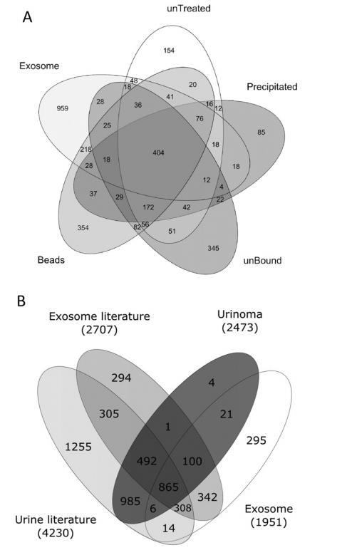 圖2維恩圖。A:外泌體和尿液中總蛋白質的維恩圖;B:文獻和我們的數據以及健康供體尿瘤中外泌體數據的維恩圖,顯示常見和不常見的蛋白質。數字代表各自重疊和非重疊區域中的不同蛋白質。
