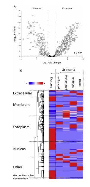 圖4外泌體和尿瘤分層聚類分析的火山圖和熱圖。A,根據外泌體和尿瘤中所有已鑒定蛋白質的折疊變化(Log2)和P值(-Log10)繪制的火山圖。白色圓圈表示外泌體和尿瘤中發生顯著統計學變化的1660個蛋白質。共有1464個蛋白質在外泌體中富集(右側),而196個蛋白質在外泌體中代表性不足(左側)。P值為>0.05的蛋白質顯示為黑點。B,基于細胞組分基因本體注釋的外泌體和不同尿液組分蛋白質組的無監督二維分層聚類熱圖。在熱圖中,每一行代表一種蛋白質,每一列對應每組12個樣本的平均值。與每個蛋白質的平均值相比,蛋白質豐度的歸一化Z評分用偽彩色標度表示,正表達(紅色)、等表達(白色)和負表達(藍色)。樹狀樹枝圖顯示了無監督分層聚類分析的結果,將相似的蛋白質組特征值相互靠近。對樹枝圖和熱圖的目視檢查表明,外泌體和尿瘤組有明顯的聚類。