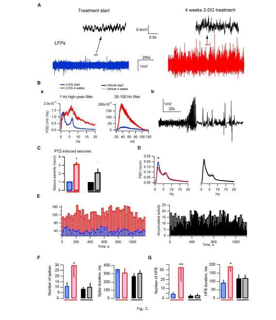經2-DG處理的無自發性癲癇發作的大鼠(n=8)也表現出神經元網絡活動異常。如圖2D所示,經歸一化處理的平均PSD(所有大鼠;每只大鼠的PSD均歸一化為總PSD積分)顯示,經2-DG處理的大鼠在Δ范圍頻率(1-4Hz)的功率顯著降低。此外,這些動物還表現出一種過度活躍的網絡狀態,表現為"超基底"活動的顯著增加,即振幅超過基底水平的信號。此類事件可能由不同類型的生理或病理活動觸發,其累積水平可作為網絡興奮性的衡量標準。我們計算了所有LFP記錄中連續20秒的累積活動(見方法),并對各組大鼠的累積活動進行了平均(圖2E),結果發現2-DG處理后LFP累積活動顯著增加,表明誘發的陣發性活動水平很高。處理還導致高振幅尖峰的數量顯著增加(從每10分鐘記錄10.9±4.0到29.2±12.8,n=10;P<0.02;圖2F)。此外,2-DG還能誘導產生在60至250Hz頻率范圍內檢測到的多個高頻尖峰(從每10分鐘記錄4.2±1.9到32±14.5,n=10;P<0.01;圖2G;參見"方法"中的"LFP分析")。癲癇患者和動物癲癇模型的腦電圖中都曾出現過HFBs,它們被認為反映了與癲癇發生相應的病理活動。PTZ癲癇發作試驗(評估神經組織興奮性的變化)顯示,2-DG處理的大鼠癲癇發作閾值降低(圖2C)。共有三只經2-DG處理的大鼠死亡,其中一只是因為在記錄過程中強直-陣攣發作(圖2Bb),另外兩只是在夜間死亡(可能也是由于癲癇發作)。這些事件以及記錄的參數和分析有力地證明,2-DG確實會誘發網絡過度興奮,導致自發性癲癇發作。