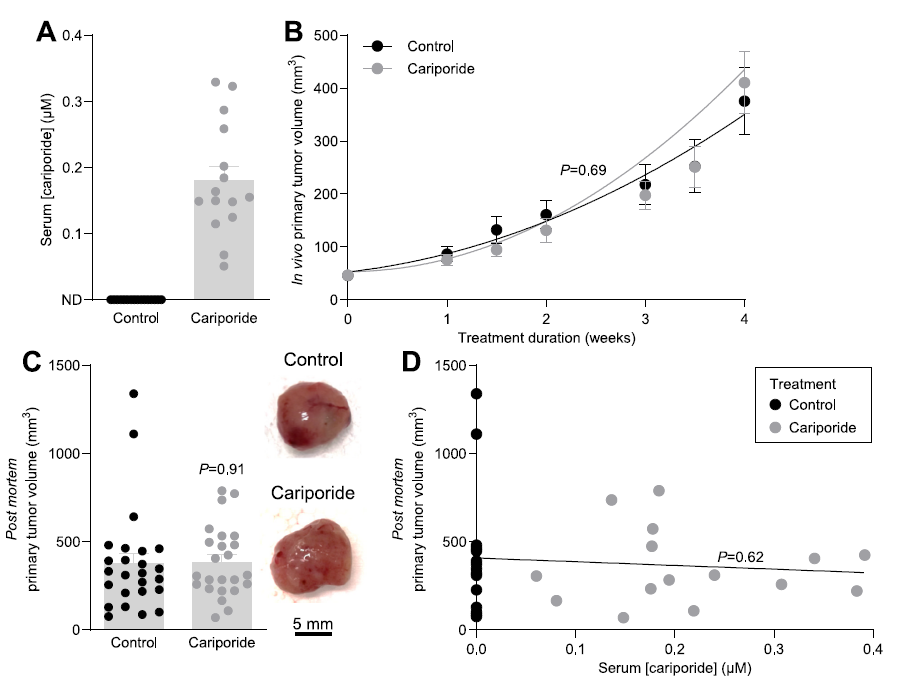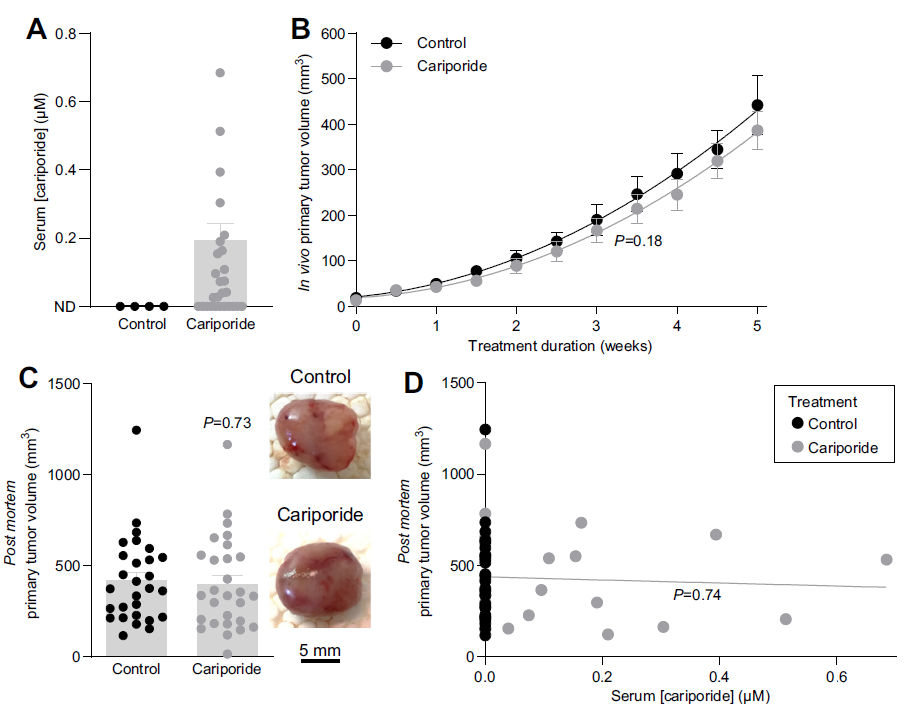 圖4、通過滲透微型泵供應的卡立泊利不會影響原發性乳腺癌的生長。A)通過滲透微型泵(n=15-16)接受卡立波利或NaCl載體的小鼠血清中測量的卡立泊利濃度。ND,檢測不到。B)體內腫瘤體積測量(n=24-25)。顯示最佳二階多項式函數,并通過額外的平方和F檢驗進行比較;P值與對照。C)死后腫瘤切除后的離體腫瘤體積測量(n=24-25)。D)圖C的離體腫瘤體積繪制為圖A中相應血清卡立普利濃度的函數。通過最小二乘線性回歸分析比較數據