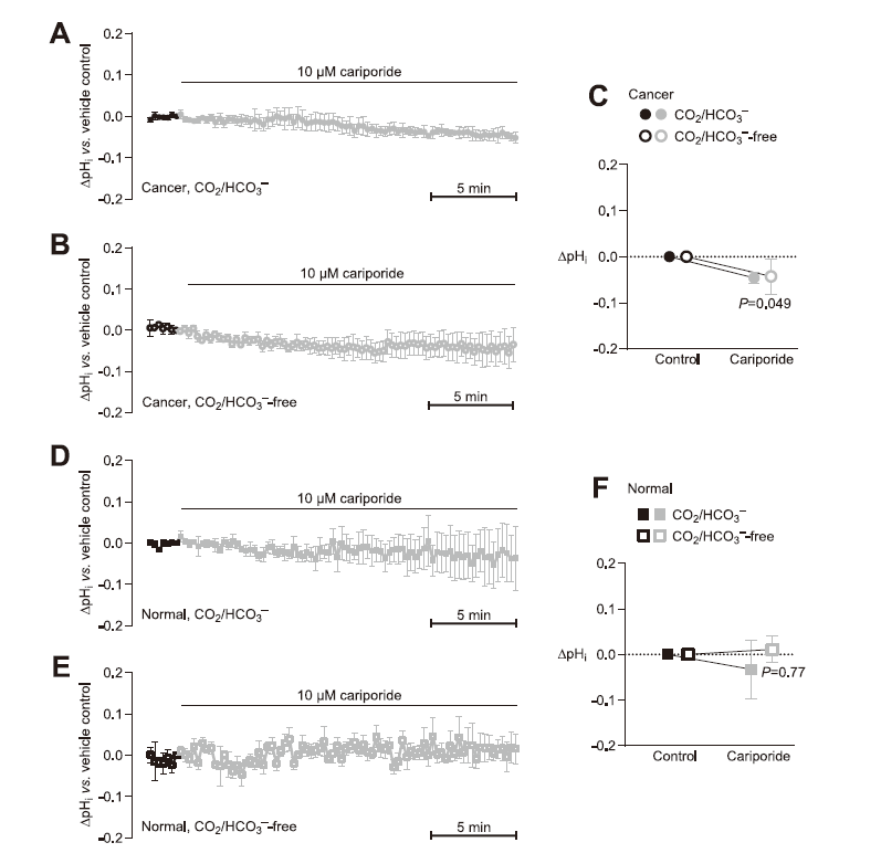 圖2、Cariporide略微降低乳腺癌組織中的穩態pH。A、B、D、E.從乳腺癌組織(A,B)或正常乳腺組織(D,E)中急性分離的pHin原代類器官的平均痕量。在存在(A,D)或不存在(B,E)CO/HCO的情況下施用卡立泊利(10μM),我們報告了與匹配的載體/時間對照(n=4)相比的pH值差異。C,F.在存在和不存在CO/HCO(n=4)的情況下,研究了從乳腺癌組織(C)和正常乳腺組織(F)分離的原代類器官中對10μM卡立泊利應用的pH反應,并相對于匹配的載體/時間對照進行了報告