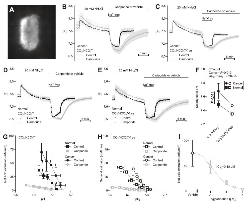 圖1、卡里柏利抑制乳腺癌組織的凈酸擠出,IC為0.18μM。A.從乳腺癌組織中分離并加載pH敏感熒光團BCECF的原代類器官的圖像。B-E.在NH預脈沖實驗期間從初級類器官測量的pH值的平均痕量(n=5-8)。卡里柏利以10μM施用。F.從乳腺癌組織和正常乳腺組織中急性分離的原代類器官的靜息穩態pH,并在存在和不存在CO/HCO的情況下進行評估(n=7-8)。通過雙向方差分析比較數據,然后進行ˇSíd'ak后測試。G,H.凈酸擠出活性繪制為pH值的函數(n=7-8)。卡里柏利濃度為10μM。比較了基于最小二乘線性回歸分析計算的曲線的截距和斜率。當暴露于不同濃度的卡立波利時,在沒有CO/HCO的情況下,NH前脈沖誘導的酸化后,原發性乳腺癌類器官在平均pH值為6.8時評估的凈酸擠出(n=7-9)。