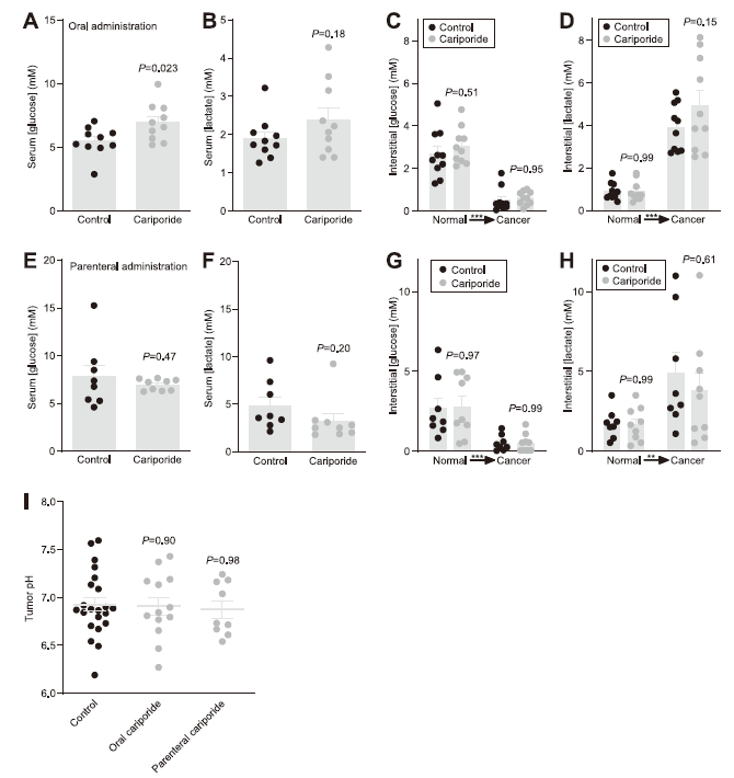 圖5、口服但非腸外給藥卡立泊利會升高血糖濃度。A、B、E、F.通過飲用水(A,B,n=10)或滲透微型泵(E,F,n=8–9)暴露于卡立泊利或載體的小鼠的血清葡萄糖(A,E,E)和乳酸(B,F)和乳酸(B,F)濃度。C、D、G、H.通過飲用水(C,D,n=10)或滲透微型泵(G,H,n=8–9)從暴露于卡立波利或載體的小鼠的乳腺癌和正常乳腺組織中通過微透析取樣測量的間質葡萄糖(C,G)和乳酸(D,H)和乳酸(D,H)濃度。I.用pH敏感微電極(n=9–22)測量體內腫瘤pH值。面板A、B、E和F中的數據通過未配對的雙尾學生t檢驗進行比較,在C、D、G和H中通過重復測量雙向方差分析后跟ˇSíd'ak后測,在圖I中通過單因素方差分析后跟Dunnett后測。P值與相同條件下的對照。