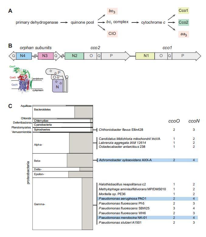 生化、遺傳和基因組分析表明,通常由操縱子編碼的CcoN和CcoO亞基形成cbb3型氧化酶的最小功能單元(Ducluzeau et al.,2008;de Gier et al.,1996;Zufferey et al.,1996)。CcoN是膜整合的催化亞基,包含兩個b型血紅素和一個銅離子。CcoO是膜錨定的,包含一個c型血紅素。額外的氧化還原亞基和/或參與復合物組裝的亞基,如CcoQ和CcoP,可以由相鄰基因編碼(圖1B)。ccoNO包含的簇廣泛分布于細菌域的多個門(Ducluzeau et al.,2008)。我們使用EggNOG數據庫(包含超過3000種細菌物種的代表性基因組(Huerta-Cepas et al.,2016))來獲取關于cco基因存在和頻率的概覽。在查詢的3318個細菌基因組中,我們發現467個具有完整的cco操縱子(編碼具有O和N亞基的潛在功能性cbb3型氧化酶)。其中,78個包含多于一個完整的操縱子。我們還使用EggNOG通過檢查單個基因組中ccoO和ccoN同源物的相對數量來尋找孤兒ccoN基因。我們發現了14個基因組,其中假單胞菌屬物種占比過高,它們包含孤兒ccoN基因(圖1C),我們的分析產生了三個包含不止一個孤兒ccoN基因的物種:門多薩假單胞菌(Pseudomonas mendocina)、銅綠假單胞菌(Pseudomonas aeruginosa)和木糖氧化無色桿菌(Achromobacter xylosoxidans)。門多薩假單胞菌是一種土壤細菌和偶發的醫院病原體,基于16S rRNA基因序列比較(Anzai et al.,2000)與銅綠假單胞菌密切相關。相反,木糖氧化無色桿菌屬于一個不同的變形菌綱,但盡管如此,它經常被誤認為是銅綠假單胞菌(Saiman et al.,2001)。與銅綠假單胞菌類似,它是一種機會性病原體,可在免疫功能低下個體和囊性纖維化患者中引起肺部感染(De Baets et al.,2007;Firmida et al.,2016)。Hirai等人先前報道了基于ClustalW對假單胞菌屬CcoN同源物的分析,表明在EggNOG數據庫中未代表的額外物種中也存在孤兒基因。這些包括反硝化假單胞菌(P.denitrificans),它包含兩個孤兒基因(Hirai et al.,2016)。