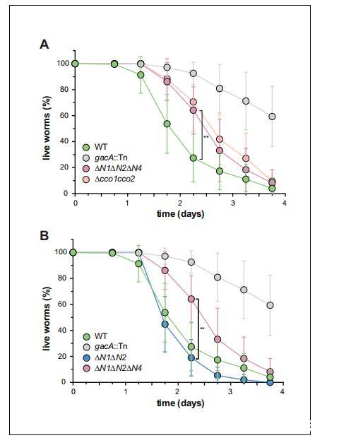 圖6含CcoN4的同工酶對PA14的毒力有獨特貢獻WT、gacA和各種cco突變株在線蟲秀麗隱桿線蟲中的緩慢殺滅動力學。暴露于WT PA14的秀麗隱桿線蟲群體在接觸該細菌4天后幾乎100%死亡,而缺乏GacA(一種控制銅綠假單胞菌毒力基因表達的調節因子)的突變體則顯示殺滅率下降,暴露后4天仍有約50%的蠕蟲存活。(A)與WT相比,ΔN1ΔN2ΔN4和Δcco1cco2的致病性明顯減弱。誤差條代表至少6個生物重復的標準偏差。暴露后2.25天,ΔN1ΔN2ΔN4殺死的elegans明顯少于WT(非配對雙尾t檢驗;p=0.0022)。(B)與WT相比,ΔN1ΔN2的致病性僅略有降低。暴露后2.25天,ΔN1ΔN2殺死的elegans明顯多于ΔN1ΔN2ΔN4(非配對雙尾t檢驗;p=0.003)。誤差條代表至少4個生物重復的標準偏差,每個重復的起始樣本量為30-35個蠕蟲。