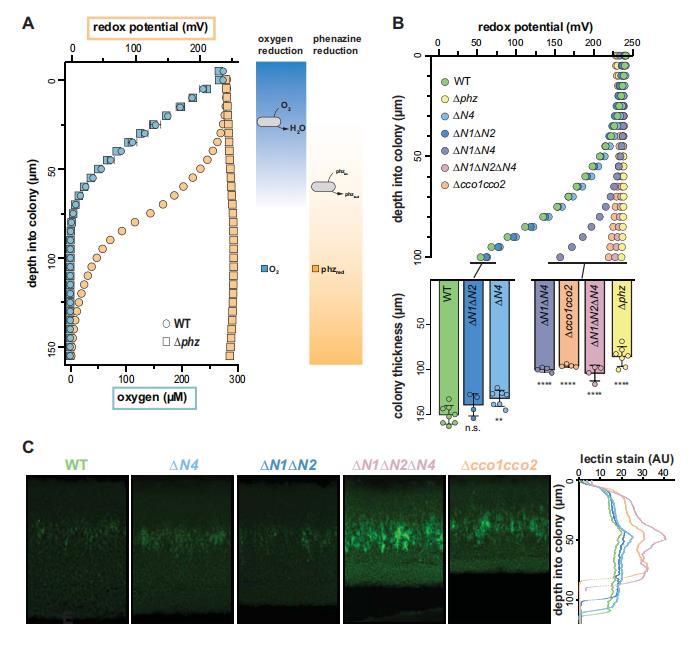 圖5 PA14 WT和突變體菌落生物膜中化學梯度和基質分布的特征。(A)左圖:生長兩天的WT和Δphz生物膜的氧氣濃度(藍色)和氧化還原電位(橙色)隨深度的變化。WT生物膜厚約150μm,而Δphz生物膜厚約80μm。對于O2曲線,誤差條代表生物三重樣的標準偏差。對于氧化還原曲線,數據代表至少5個生物重復。右圖:描述生物膜中O2和還原與氧化酚嗪類分布的模型。(B)頂部:生長2天的WT和各種突變生物膜的氧化還原電位隨深度的變化。至少5個生物重復的數據具有代表性。下圖所述菌株3天菌落生物膜的厚度。(C)左圖:WT和cco突變體生物膜的代表性薄切片,用凝集素染色并用熒光顯微鏡成像。生物膜在取樣前已生長2天。右圖凝集素染色信號強度的相對量化。左側面板中菌株名稱的顏色為繪制數據提供了一個關鍵,右側面板中的y軸為左側面板提供了一個刻度條。凝集素染色圖像和數值代表4個生物重復。