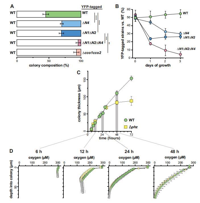 圖3 CcoN4在生物膜中具有競爭優勢,尤其是當O2成為限制條件時。(A)與WT在混合菌株生物膜中共同培養3天后,各種YFP標記的cco突變體的相對適應性。(B)顯示各種cco突變體與WT在混合菌株生物膜中共同培養3天的相對適應性的時間過程。圖中顯示的是WT與各種"標記"菌株(即設計為組成型表達YFP的菌株)共培養的實驗結果。(已標記的WT與未標記的突變體共培養的實驗結果見圖3-圖補充1)。誤差條代表生物三倍體的標準偏差。(C)通過薄片和DIC顯微鏡評估WT和Δphz的菌落生物膜在3天發育過程中的厚度變化。開始起皺后,測定基部(即皺紋之間的"谷")的厚度。(D)生物膜形成最初3天內選定時間點的菌落O2曲線。灰色點標記表示在菌落正下方的瓊脂中進行的測量。