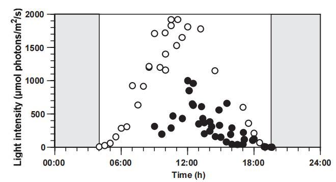 圖4點1的日照強度的晝夜周期。晴天和陰天的光強度分別用開放的圓圈和實心圓圈表示。從日落到日出的時間跨度用灰色陰影表示。這些測量是在2003年6月進行的。