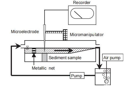 使用丙烯酸板構建了一個流動電池反應器(60(L)×10(W)×5(H)cm3)用于微電極測量(圖2)。將沉積物樣品放置在反應器中,微生物墊表面與流動電池的底部對齊。以平均液體速度為2厘米/秒向反應器供給5.0升的介質進行微電極測量。為了創建平行的、無湍流的流動,將金屬網安裝在反應器的上游。微生物墊表面上方的水深約為1厘米。在測量沉積物中的氧氣濃度剖面時,采用采樣點采集的原始河水作為微電極測量的介質。光強度從10至1900毫摩爾光子/平方米/秒進行調整。在測量沉積物中NH4+、NO2、H2S和pH的微區剖面時,使用合成介質以避免與LIX型微電極的干擾。合成介質由NH4Cl(50 mM)、NaNO2(40 mM)、NaNO3(100 mM)、Na2SO4(2000 mM)、Na2HPO4(3000 mM)、MgCl2·6H2O(84 mM)、CaCl2(200 mM)、EDTA(270 mM)組成。pH調整到7.5。光強度調整為10毫摩爾光子/平方米/秒。然后將沉積物在20℃的介質中至少培養30分鐘,以確保獲得穩態剖面。微電極安裝在電動微操作器上進行精確定位,并以0.05-0.3毫米的間隔記錄了沉積物中的濃度剖面,從散裝液體進入沉積物[13]。使用剖析顯微鏡型號Stemi 2000;卡爾蔡司確定了微生物墊的表面。實驗過程中,鹵素燈提供所需的光照。對于每個物種和條件,至少測量了沉積物中不同位置的至少三個濃度剖面。在人工光-暗周期期間測量氧氣濃度時,將沉積物照射光強為1900毫摩爾光子/平方米/秒,持續10分鐘,然后將電極插入沉積物中。然后,將沉積物遮蔽,并保持在黑暗中,直到氧氣濃度穩定。然后再次將沉積物照射光強為1900毫摩爾光子/平方米/秒,并保持在光照中,直到氧氣濃度穩定。進行兩次光-暗周期后,將電極插入更深的層次中。