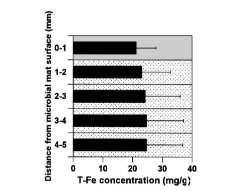圖3點1沉積物中T-Fe的平均濃度剖面。誤差條代表測量的標準偏差。微生物墊和沉積物分別用灰色區域和虛線區域表示。