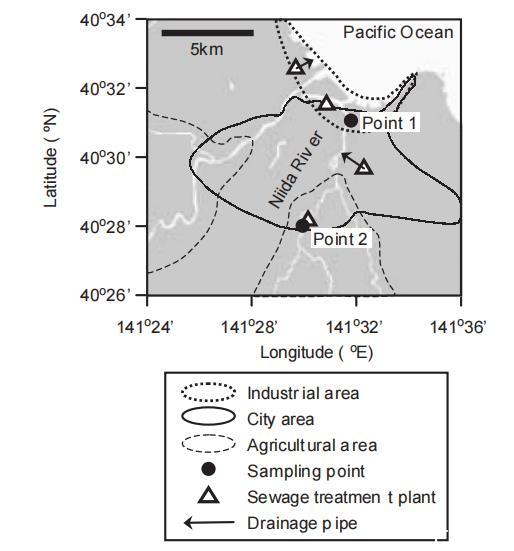 圖1顯示了日本八戶市新井田河中采樣點(點1和點2)的地圖。