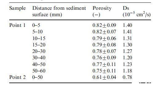表2調查沉積物相關深度處的孔隙度和有效沉積物氧擴散系數(Ds)的平均值和標準偏差。