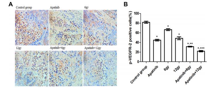 圖4 VEGFR-2磷酸化(p-VEGFR-2)在CNE-2鼻咽癌(NPC)腫瘤組織中的表達。A、使用p-VEGFR-2抗體對接受不同治療方案的異種移植CNE-2鼻咽癌小鼠進行免疫組化染色。B、治療組內p-VEGFR-2陽性率(%)。與對照組相比,*P<0.05。**P<0.05與阿帕替尼組相比,6 Gy。與阿帕替尼組(12 Gy)相比,***P<0.05。