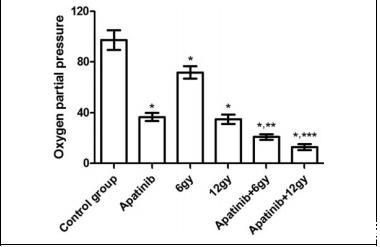 圖3腫瘤組織氧分壓。小鼠安樂死后測定氧分壓。*P<0.05與對照組相比。**P<0.05與阿帕替尼組(6 Gy)相比。與阿帕替尼組(12 Gy)相比,***P<0.05。