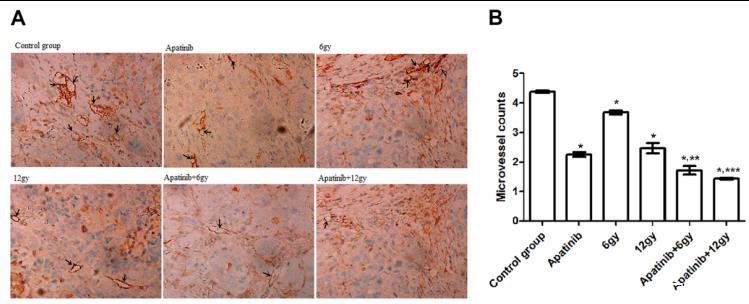 CD31陽性細胞呈棕色,在腫瘤組織中呈異質性分布(圖5),用于測定MVD,作為血管生成的標志物。對照組小鼠的MVD高于其他組小鼠(P<0.05)。經12 Gy處理的小鼠的MVD比經6 Gy處理的小鼠低(P<0.05)。此外,與單獨使用阿帕替尼或放療的小鼠相比,阿帕替尼+放療聯合治療組小鼠的MVD更低(P<0.05)。