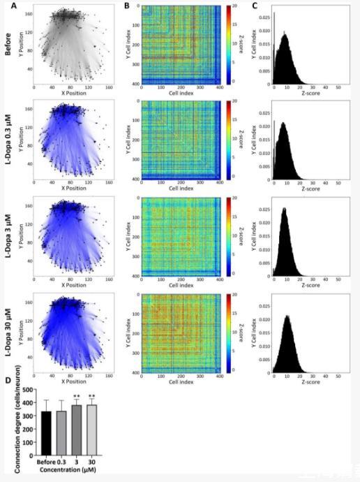 該圖評估L-DOPA對網(wǎng)絡的影響:(A)連接圖:黑線為基線Z-score≥3的細胞對,藍線為藥物處理后新增連接;(B-C)熱圖與分布:L-DOPA使Z-score整體右移;(D)定量:3μM和30μM L-DOPA顯著增加每細胞連接數(shù)。圖示證實藥物增強網(wǎng)絡同步性。