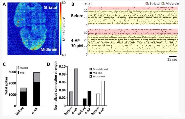 該圖評估組裝體的跨區(qū)域活性:(A)峰值電位圖:上部紋狀體、下部中腦均有活性;(B)raster圖:4-AP處理后spike增多;(C-D)定量:4-AP使區(qū)域內(紋狀體/中腦)和區(qū)域間連接強度均顯著升高。圖示證實藥物增強組裝體的跨區(qū)域通信。