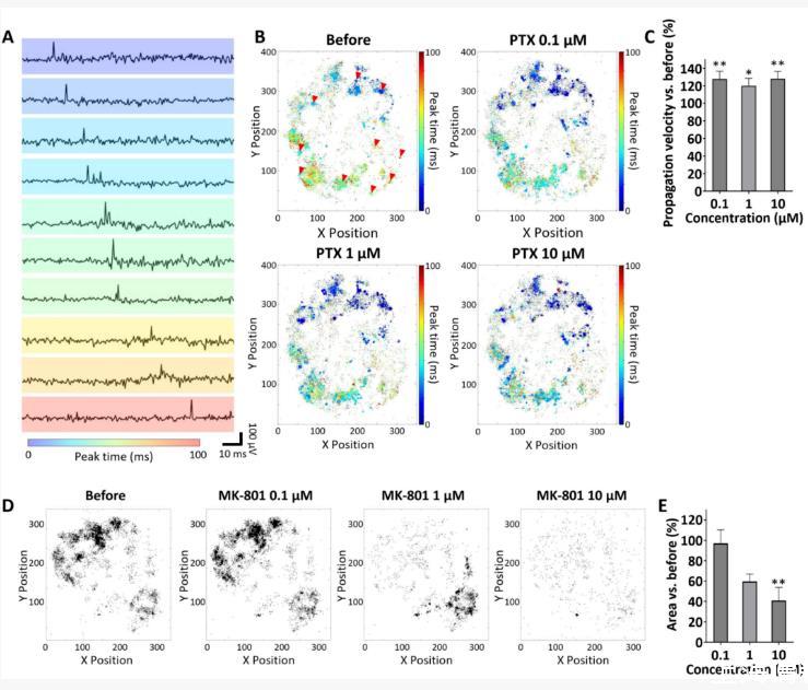 該圖解析傳播速度與面積:(A-B)傳播波形與峰值延遲圖:荷包牡丹堿處理后峰值傳播更快速;(C)定量:荷包牡丹堿使傳播速度顯著升高;(D-E)傳播電極圖與面積:MK-801使大部分區(qū)域傳播消失,僅局部保留,整體面積減少。圖示建立傳播動力學作為藥物響應新端點。