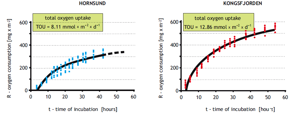 圖2、霍恩松德(左側面板)和康斯峽灣(右側面板)在兩個區域環境溫度下,沉積物總耗氧量[mg/m2]隨孵化時間的變化;計算的總耗氧量(TOU)。