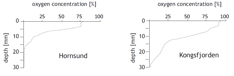 圖4、霍恩松德(左側面板)和康斯峽灣(右側面板)30毫米厚沉積物表層的氧氣濃度剖面。