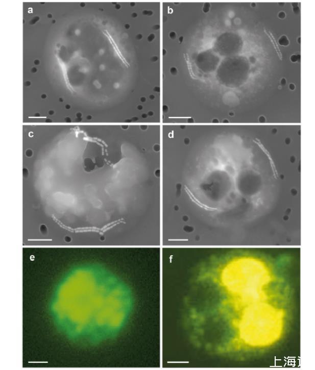 圖2、亞氧化區大型球形細胞的顯微圖像。展示了從黑海亞氧化區分離的大型球形細胞的顯微圖像。a-d)電子顯微圖像顯示這些球形細胞(4.6-6.8μm)含有兩條鐵富集晶體鏈、磷富集內含物(27-30%P)和幾個類似液泡的中空結構。e)使用針對Magnetococcus家族特異性探針(MaCo983)染色的熒光圖像,證實這些細胞與Magnetococcus屬相關。f:DAPI染色顯示細胞內的黃色聚磷酸鹽(polyP)內含物。