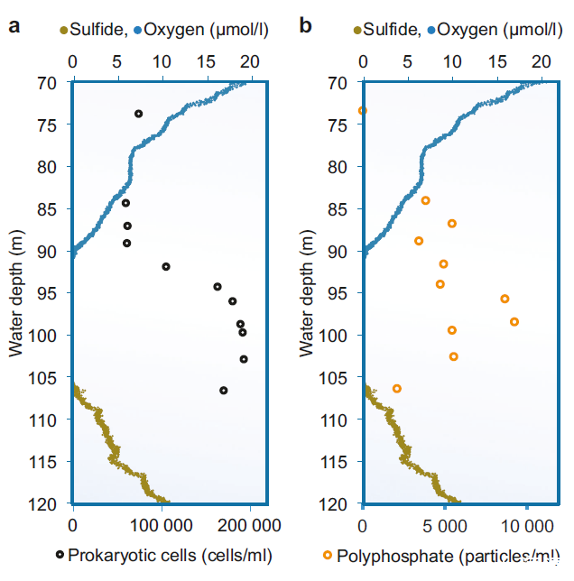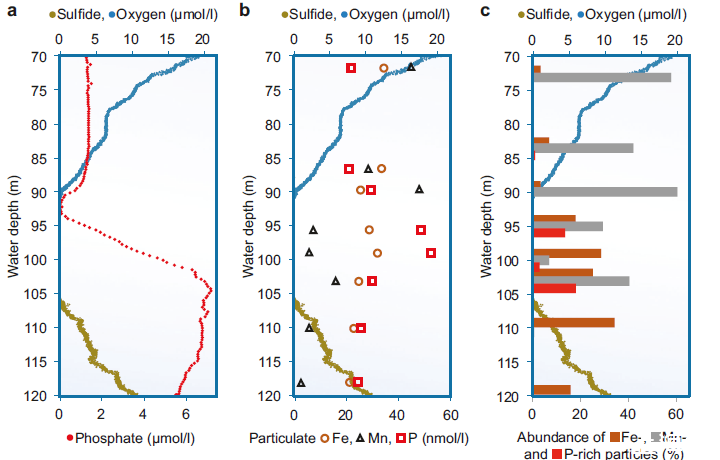 圖1、黑海亞氧化區的剖面圖。圖中顯示了黑海亞氧化區的化學物質濃度剖面。該區域位于90-106米水深之間,特點是既檢測不到氧氣(藍色圓點)也檢測不到硫化物(綠褐色圓點)。圖中顯示了溶解磷酸鹽在亞氧化區上邊界出現明顯最小值,在下邊界出現最大值。