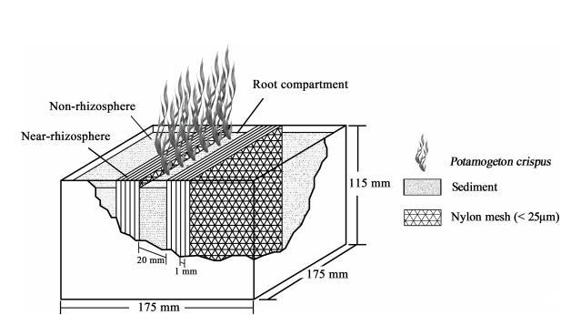 使用具有多層隔室的三隔室根箱培養(yǎng)菹草。根箱根據(jù)He et al.(2005)的設(shè)計進(jìn)行了修改(圖1)。每株植物在培養(yǎng)期間完全浸入水箱(高度350毫米)底部。使用風(fēng)干沉積物填充三個隔室。根箱包含三個部分:根區(qū)隔室(寬度20毫米)、近根際區(qū)隔室(5毫米)和非根際區(qū)隔室(>5毫米)。近根際區(qū)隔室通過尼龍網(wǎng)(<25μm)進(jìn)一步分成五個子隔室(厚度1毫米),以防止根毛進(jìn)入相鄰的沉積物夾層,并保持沉積物夾層中的微生物和根系分泌物分離。