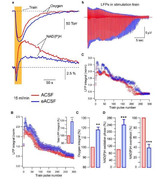 圖5、在充足氧氣供應下,富含能量底物的ACSF增強氧化代謝和突觸功能。A)氧分壓和NAD(P)H瞬態以及LFPs,展示了在富含能量底物的ACSF(eACSF)中,30秒10Hz刺激引起的氧分壓和NAD(P)H自熒光的變化,以及LFPs的動態變化。B)LFPs積分值,展示了在eACSF中,LFPs積分值的變化。在eACSF中,LFPs的幅度顯著增加。C)氧分壓和NAD(P)H信號參數。展示了在eACSF中,氧分壓和NAD(P)H信號參數的變化。