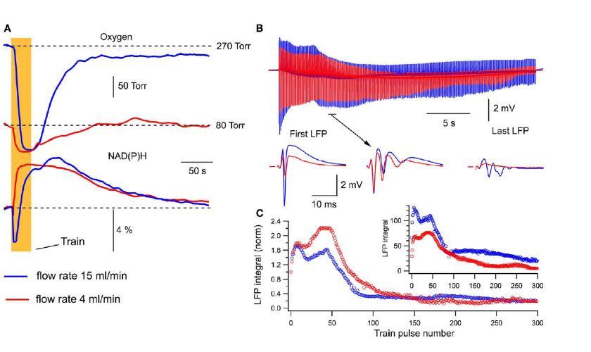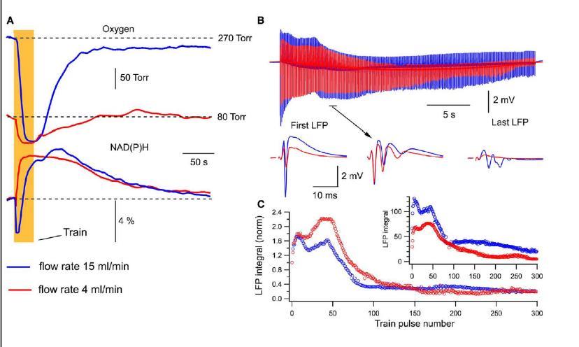 圖3、不同灌流速率下的氧分壓、NAD(P)H信號和LFPs。A)氧分壓和NAD(P)H自熒光。展示了在15ml/min和4ml/min灌流速率下,氧分壓和NAD(P)H自熒光的變化。B)LFPs在刺激訓練中的變化。展示了在不同灌流速率下,LFPs在30秒10Hz刺激訓練中的變化。C)LFPs積分值的比較。展示了不同灌流速率下,LFPs積分值的變化。在4ml/min時,LFPs積分值顯著下降。