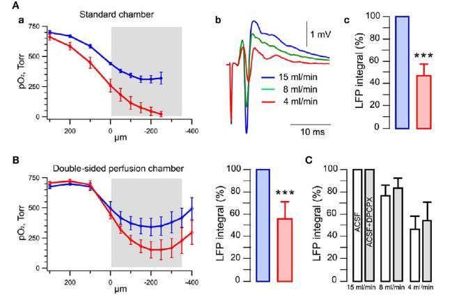 圖1、灌流速率對切片氧分壓和LFP幅度的影響。A)氧分壓深度分布,(a):展示了在15ml/min和4ml/min灌流速率下,腦切片中的氧分壓深度分布。圖中灰色條表示切片的位置。在15ml/min時,切片核心的氧分壓約為300Torr,而4ml/min時,切片核心的氧分壓急劇下降。(b)在CA1區記錄的LFPs,由單次刺激Schaffer collateral(SC)引起。LFPs的幅度在15ml/min時顯著高于4ml/min。(c)統計總結了不同灌流速率下LFP積分值的變化。15ml/min時的LFP積分值顯著高于4ml/min。B)雙層灌流室中的氧分壓。C)阿登苷酸受體拮抗劑DPCPX對LFP的影響。