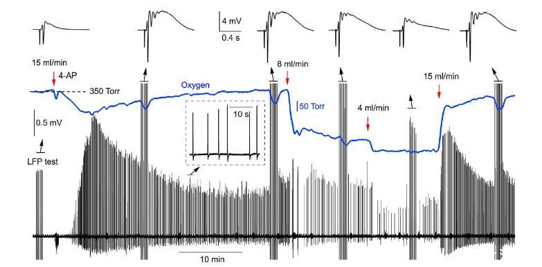 圖4、4-AP誘導的同步網絡活動對灌流速率的依賴性。展示了在不同灌流速率下,4-AP誘導的同步網絡活動的LFPs和氧分壓的變化。