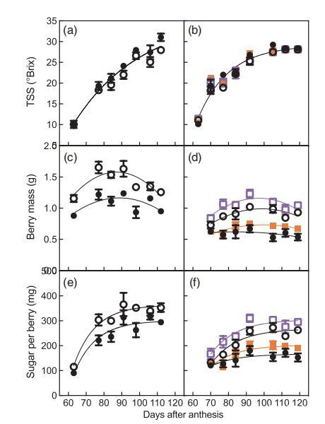 圖2、第1季漿果成熟期(a,c,e)和第2季漿果成熟期(b,d,f)顯示(a,b)總懸浮固體含量、(c,d)漿果鮮重和(e,f)每粒漿果含糖量。處理為:常溫灌溉(A+I)(白圈)、常溫非灌溉(A+NI)(黑圈)、升溫和灌溉(H+I)(白方塊)、升溫和非灌溉(H+NI)(橙方塊)。若顯示不同的擬合線,則表明擬合線之間存在顯著差異。