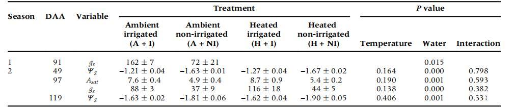 在第二季,中午的莖干水勢(ψs)反映了對NI葡萄藤的水分脅迫。升溫葡萄藤沒有表現(xiàn)出水分脅迫,在氣體交換性狀或ψs方面與灌溉沒有相互作用(表1)。在第二季中,有兩次觀察到NI藤蔓的gs受到類似的抑制,與A+I藤蔓相比,光飽和時的二氧化碳凈同化(Asat)顯著降低(表1)。