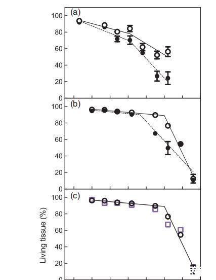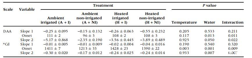 將第2季的CD與花期開始的熱時間作圖(圖3e),結(jié)果表明,與A+I葡萄藤相比,A+NI葡萄藤的活體組織開始快速衰退的時間更早,快速階段(斜率2)也更小(表2)。升溫增加了CD快速階段開始的熱時間,并且與灌溉有顯著的交互作用(表2)。缺水減緩了未升溫葡萄植株活體組織的快速衰退(斜率2),且與溫度有顯著的交互作用(表2)。在快速階段開始之前,處理或交互作用對CD緩慢階段的斜率沒有影響(表2)。