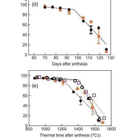 圖3、第1季(a)和第2季(b-d)從花期開始的一段時間內(nèi)漿果活體組織的比例,以及從花期開始的熱量時間內(nèi)(e)比較以下處理:常溫灌溉(A+I)(白圈)、常溫非灌溉(A+NI)(黑圈)、升溫灌溉(H+I)(白方塊)、升溫非灌溉(H+NI)(橙方塊)。為清楚起見,(c)中重復(fù)了A+I,以便與H+I進(jìn)行比較;(d)中重復(fù)了A+NI,以便與H+NI進(jìn)行比較。