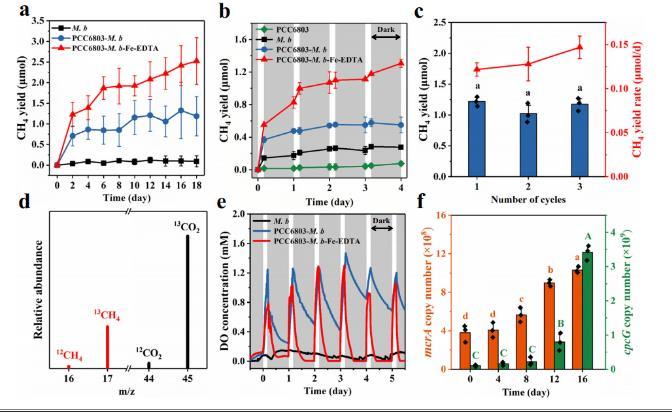 圖2、光照-黑暗周期中的光驅動甲烷生成。a)PCC6803-M.b-Fe-EDTA和對照組的甲烷產量。b)前四天的甲烷產量典型時間變化。c)三個連續18天周期中的甲烷產量和產率。d)使用13C標記的NaHCO3作為唯一碳源的氣體質量譜分析。e)溶解氧(DO)濃度的周期性變化。f)mcrA和cpcG基因拷貝數的評估。在b和e中,灰色區域表示光驅動甲烷生成中的黑暗期,光-暗周期為4小時-20小時。數據以平均值±標準差表示,來自n=3次獨立實驗。統計分析采用配對雙尾t檢驗,不同字母表示不同組之間具有統計學顯著差異(P<0.05)。所有P值已在源數據中提供。源數據作為源數據文件提供。