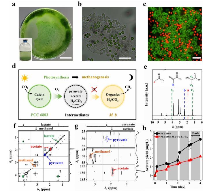 圖3、共培養生物膜和產生的有機物質的特征化。a培養瓶中的密集生物膜(插圖顯示了培養瓶的圖片)。b光學顯微鏡圖像和c FISH圖像,使用M.b(綠色熒光探針)和PCC6803(紅色,自體熒光);代表10幅圖像。d生物甲烷生成的示意圖,通過PCC6803-M.b-Fe-EDTA驅動的中間產物。e通過ROS氧化生成的可能有機物質。f gCOSY(f)和gHMBC(g)重疊的水溶液600-MHz NMR光譜,分別為共培養6天后的上清液(黑色),0.1 M乳酸(綠色),0.1 M醋酸(紅色),0.1 M丙酮酸(藍色),和0.1 M甲醇(橙黃色)。在(g)中的紅色圓圈峰歸屬于醋酸,藍色圓圈峰歸屬于丙酮酸,橙黃色圓圈峰歸屬于甲醇。h在4小時-20小時的光-暗周期下醋酸濃度的變化。灰色區域表示黑暗期。數據以平均值±標準差表示,來自n=3次獨立實驗。比例尺:a為1μm,b為10μm,c為10μm。
