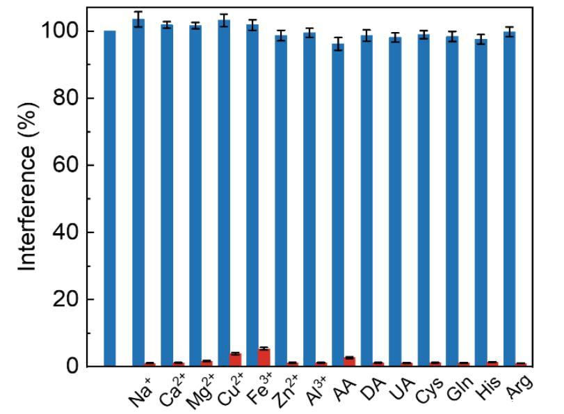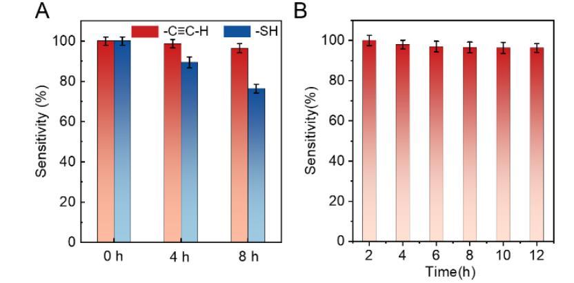 電化學傳感器的選擇性對于復雜腦環境中的體內應用至關重要。我們針對實際腦系統中共存的各種物質(包括金屬離子(Na?、Ca2?、Mg2?、Cu2?、Zn2?和Al3?)、生物物種(AA、DA和UA)及氨基酸(Cys、Gln、His和Arg))進行了LAC的選擇性和競爭性測試。結果表明,所有干擾物的響應均小于3.5%(圖6),證明適配體修飾微電極具有高選擇性。此外,還研究了電極的穩定性。將兩種分別修飾炔基和巰基適配體的微電極浸入GSH溶液(5 mmol·L?1)中模擬活體腦環境(圖7A)。發現炔基修飾微電極在浸泡8 h后仍保持96.4%的靈敏度,而巰基修飾電極僅剩76.4%。結果表明炔基修飾法可有效抵抗其他富硫醇物質的干擾。接下來,還在不含K?的人工腦脊液(aCSF)中測試了炔基修飾微電極LAC的時間穩定性。結果表明,LAC在aCSF中連續浸泡12 h后仍保持96.3%的靈敏度,證明LAC電極具有高穩定性(圖7)。