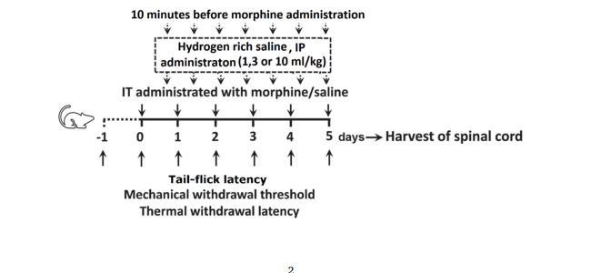 手術(shù)后恢復(fù)7天后,大鼠被隨機(jī)分為7組(n=8):無知覺組(N):未接受任何治療;藥物組(V):?jiǎn)岱冉M(M):給大鼠腹腔注射嗎啡(每次10μg/10μl,每天兩次,8:00和20:00),共5天;富氫生理鹽水組(HS):給大鼠腹腔注射嗎啡(每次10μg/10μl,每天兩次,8:00和20:00),共5天:M+HS組:在注射嗎啡前10分鐘腹腔注射不同劑量的HS(1、3和10mL/kg),每天兩次,共5天。每次注射嗎啡或HS前15分鐘注射DHK(10毫克/千克,靜脈注射)、頭孢曲松(200毫克/千克,靜脈注射)。在基線(-1d)和干預(yù)后的1、2、3、4和5天測(cè)試疼痛水平。最后一次行為測(cè)試后,收集脊髓L4,6節(jié)段,如下圖所示: