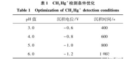 緩沖液的pH值、沉積電位以及沉積時(shí)間會(huì)直接影響CH3Hg+在金微電極表面的沉積過(guò)程,進(jìn)而影響CH3Hg+檢測(cè)的靈敏度。通過(guò)考察以上參數(shù)對(duì)0.50μg/L CH3Hg+溶出峰電流的影響,最終獲得最佳實(shí)驗(yàn)參數(shù),如表1.
