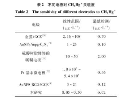 相對(duì)其他伏安技術(shù),DPV檢測(cè)有較高的靈敏度以及較好的分辨率。在優(yōu)化后的試驗(yàn)參數(shù)下:pH值為5.0的0.1 mol/L醋酸緩沖液,在——1.0 V沉積電位下富集800 s,不同質(zhì)量濃度的CH3Hg+在金微電極中的DPV氧化峰電流響應(yīng)曲線(xiàn)和金微電極對(duì)不同質(zhì)量濃度CH3Hg+的校準(zhǔn)曲線(xiàn),結(jié)果如圖3.由圖3(a)不難發(fā)現(xiàn),在金微電極上CH3Hg+于0.56 V處有一個(gè)顯著的響應(yīng)峰,并且隨著CH3Hg+質(zhì)量濃度的增大而增高。由圖3(b)可見(jiàn),CH3Hg+的溶出峰電流與其濃度在0.05——0.50μg/L內(nèi)有很好的線(xiàn)性關(guān)系,其線(xiàn)性回歸方程為I=0.354ρ-0.008,通過(guò)線(xiàn)性方程斜率計(jì)算得出靈敏度為0.354 nA/(μg·L),相關(guān)系數(shù)為0.998.按照3倍信噪比算法,得出檢測(cè)限為0.012μg/L,遠(yuǎn)低于世界衛(wèi)生組織給出的關(guān)于飲用水中CH3Hg+質(zhì)量濃度的指導(dǎo)值(1.0μg/L)。表2為不同電極對(duì)CH3Hg+檢測(cè)靈敏度的比較,由表2可見(jiàn),用于檢測(cè)CH3Hg+的傳感器相比以往檢測(cè)方法更為敏感簡(jiǎn)捷,表明金微電極分析檢測(cè)具有更廣泛的應(yīng)用前景。