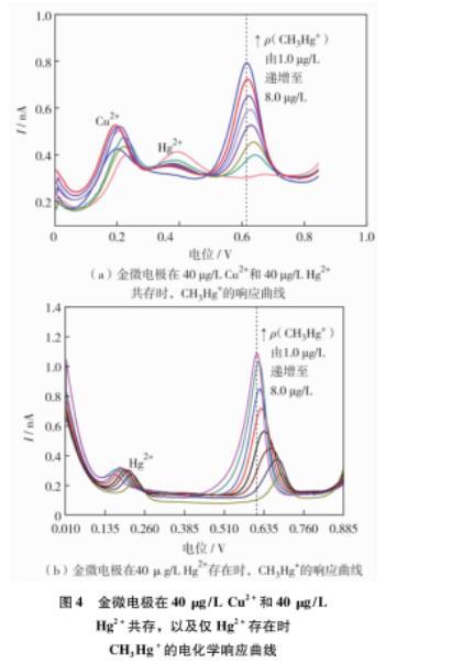 CH3Hg+檢測(cè)的最大干擾離子為無(wú)機(jī)汞Hg2+,ABOLLINO等采用金納米粒子改性玻碳電極(AuNPS-GCE)研究Hg2+存在的環(huán)境下CH3Hg+的伏安行為,實(shí)際檢測(cè)發(fā)現(xiàn),構(gòu)筑的電化學(xué)傳感器未能實(shí)現(xiàn)對(duì)CH3Hg+的選擇性分析,二者溶出峰存在重疊現(xiàn)象,添加SnCl2絡(luò)合緩沖液中的Hg2+,最終實(shí)現(xiàn)了對(duì)CH3Hg+的選擇性檢測(cè)。KOROLCZUK等開(kāi)發(fā)出一種全氟磺酸——聚四氟乙烯(nafion)修飾金膜電極研究Hg2+存在下CH3Hg+的靈敏分析,通過(guò)引入二乙烯三胺五乙酸與汞離子形成絡(luò)合物從而減少對(duì)CH3Hg+檢測(cè)的影響。本研究構(gòu)筑的金微電極可直接實(shí)現(xiàn)對(duì)僅Hg2+存在下的CH3Hg+選擇性分析。如圖4(b),隨著CH3Hg+的持續(xù)加入(ρ(CH3Hg+)為1.0——8.0μg/L),金微電極上的CH3Hg+沉積量增多,溶出電流逐漸增大,峰值電流高于無(wú)Hg2+情況下的電流值,呈現(xiàn)較好的線(xiàn)性關(guān)系,而Hg2+的溶出峰幾乎無(wú)明顯變化。這是因?yàn)榻鹞㈦姌O獨(dú)特的靈敏性以及金具有的超高導(dǎo)電性,致使其能很敏感地檢測(cè)到CH3Hg+與無(wú)機(jī)汞離子的氧化性差異,在一定的酸性條件下,能將二者很好的區(qū)分出來(lái)。研究結(jié)果進(jìn)一步說(shuō)明用金微電極可以實(shí)現(xiàn)CH3Hg+在與單一離子Hg2+共存情況下的無(wú)干擾檢測(cè)。