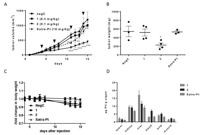 圖5、(A)等摩爾劑量的1號、2號和沙鉑在雄性SCID小鼠皮下人類HT1080細胞腫瘤的體內活性(n=4,在第4、7、11、14天(黑色箭頭所示)進行治療)。(B)第15天,所有治療組的腫瘤重量與陰性對照組相比,與對照組有顯著差異。在陰性對照組和沙鉑組中,由于分別有一只動物在第13天和第14天出現腫瘤潰瘍,因此只能確定3只動物的腫瘤重量。(C)所有治療組的體重。(D)在第15天收集的小鼠組織、血球和腫瘤中,用ICP-MS測定1、2和沙鉑的鉑濃度(平均值)。
