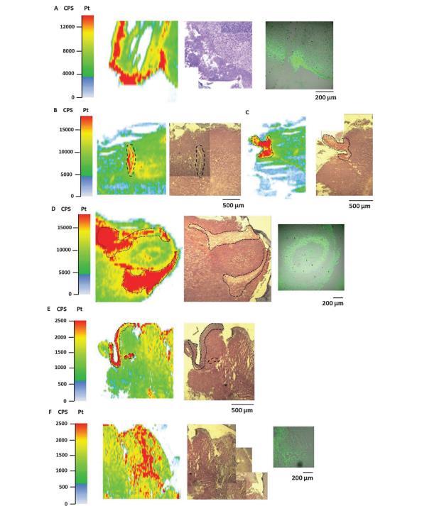 與利用ICP-MS測量組織中的平均鉑濃度相比,利用LA-ICP-MS進行生物成像在評估鉑在組織學異質結構中的分布方面具有優勢。用化合物1、2或沙鉑等摩爾處理SCID小鼠的HT1080腫瘤后,制備了LA-ICP-MS測量方法,以確定鉑在顯微鏡下的積累情況。鉑金的分布與組織學(通過連續切片的H&E染色觀察)以及共聚焦顯微鏡下通過比莫尼噠唑染色共同定位的缺氧區域相關。由于皮莫尼唑染色需要固定步驟,因此無法同時檢測壞死區域。
