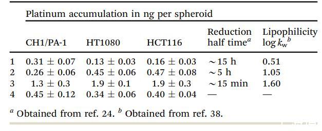表3、用1-4處理的缺氧球狀模型中的鉑積累與化合物的還原率和親脂性有關。
